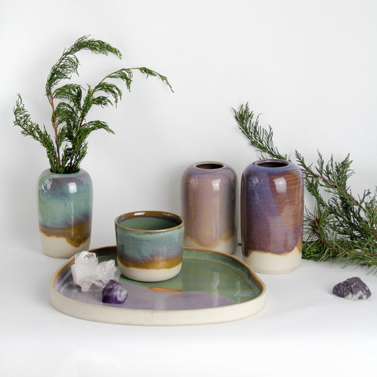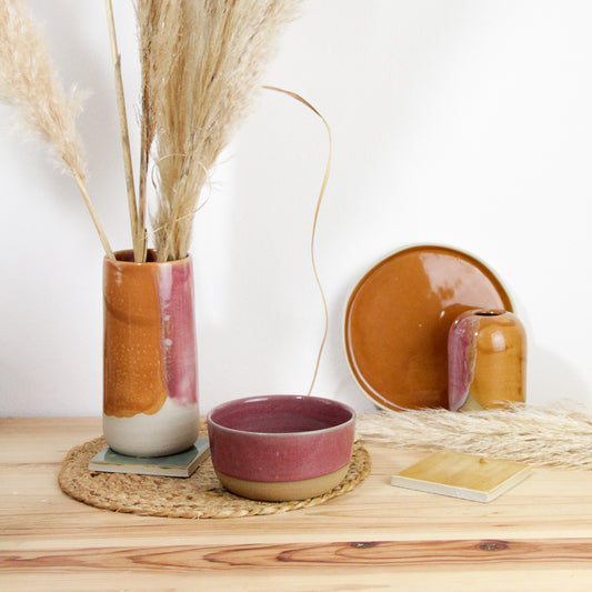 Céramiques artisanales fabriquées en France qui regroupent des petits et grands vases, des cache-pots, des plateaux, des soliflores... Les céramiques colorées s'entremêlent pour créer une jolie décoration d'intérieur. Des formes complémentaires, des couleurs vives, parfait pour décorer sa maison en fonction des humeurs.